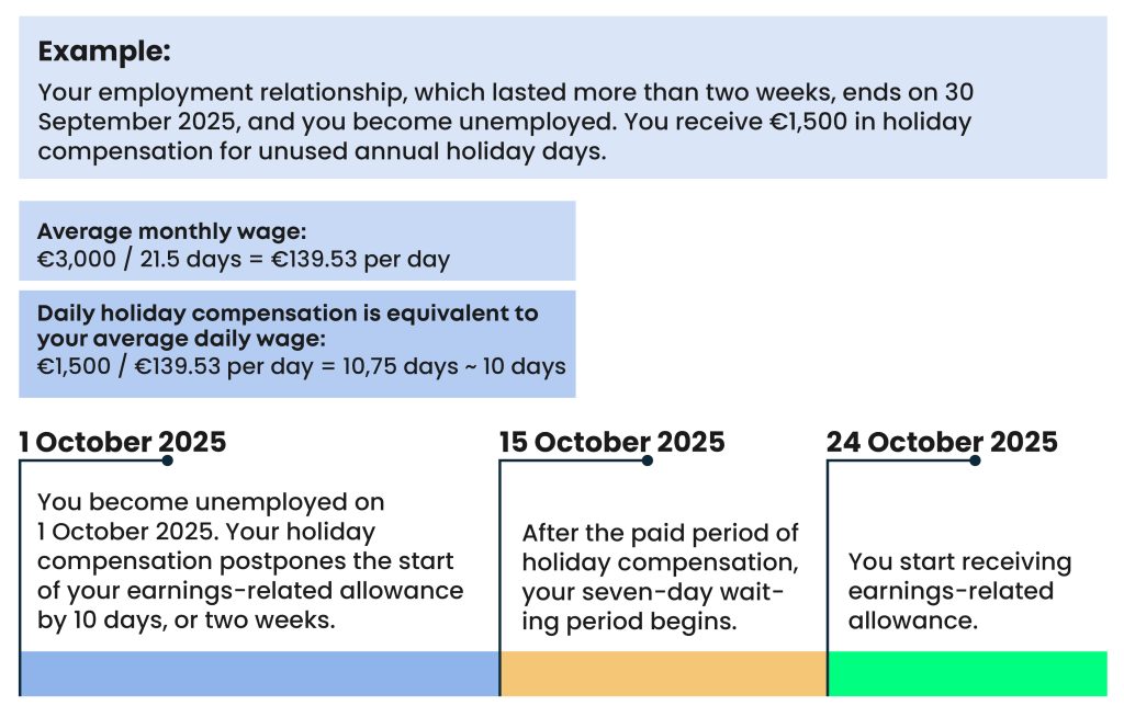 When your employment relationship ends, any unused annual holiday days postpone the start of your earnings-related unemployment allowance by the number of holiday days the holiday compensation is equivalent to at your average daily salary. The period of holiday compensation only includes weekdays.